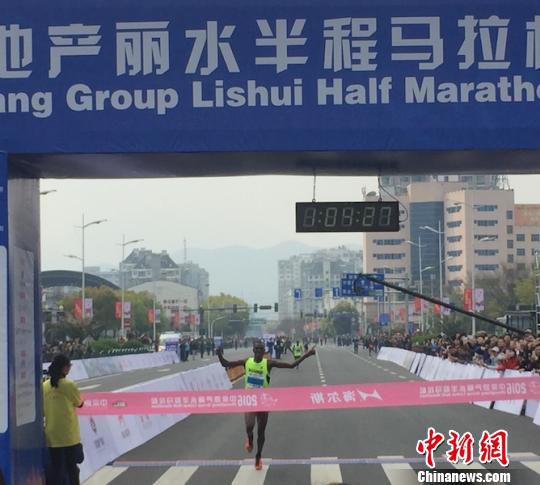 2016浙江麗水半程馬拉松開(kāi)跑,來(lái)自坦桑尼亞的男選手率先沖過(guò)終點(diǎn) 李婷婷 攝